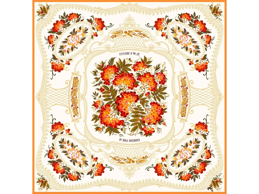 Платок Тагильский поднос станет ярким акцентом в вашем гардеробе. Насыщенная терракотово-чёрная цветовая гамма плодов всегда актуальна, а нежные оттенки цветов рябины внесут настроение романтичности и легкости.