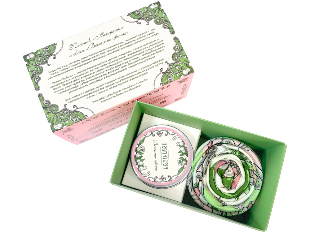 15 х 8,5 х 8,5 см, платок 90 х 90 см, свеча d6,5 х 5 |
