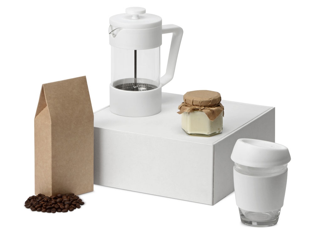Набор Бодрое утро содержит все необходимое для действительно приятного пробуждения. В нем вы найдете все, что нужно для приготовления вашей первой чашечки кофе с утра: френч-пресс, упаковку робусты темной обжарки, стакан с силиконовыми деталями и баночку крем-меда, который составит прекрасную пару крепкому напитку. Набор упакован в белую картонную коробку и переложен бумажным наполнителем. Гравировка (CO2 лазер) (Без чернения) на данный товар осуществляется бесплатно. Оплачивается только настройка оборудования в размере 1100 рублей на весь тираж.
