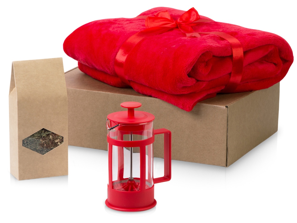 Набор продуман до мелочей. Когда зимним вечером подходит время чая, хочет завернуться в мягкий и теплый плед и наслаждаться любимым напитком, который можно заварить во френч прессе, входящем в комплект. Набор упакован в стильную крафтовую коробку. Трафаретная печать (1 цвет (цветные изделия)) на данный товар осуществляется бесплатно. Оплачивается только настройка оборудования в размере 10000 рублей на весь тираж.