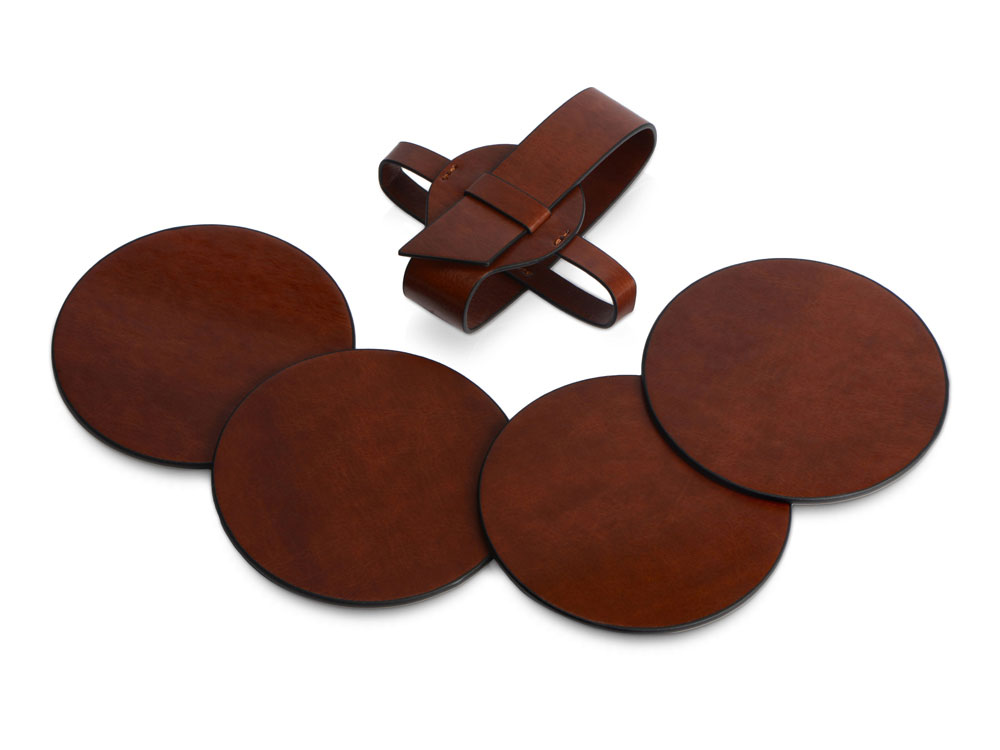 Набор состоит из четырех подставок и ремня-чехла, с помощью которого костеры очень удобно хранить в одном месте. Подставки круглой формы идеально подойдут для бокалов разного диаметра. Универсальная форма, легко моющийся материал, персонализация на самих костерах, а также ремешке. Тиснение (Блинт) на данный товар осуществляется бесплатно. Оплачивается только настройка оборудования в размере 8700 рублей на весь тираж.