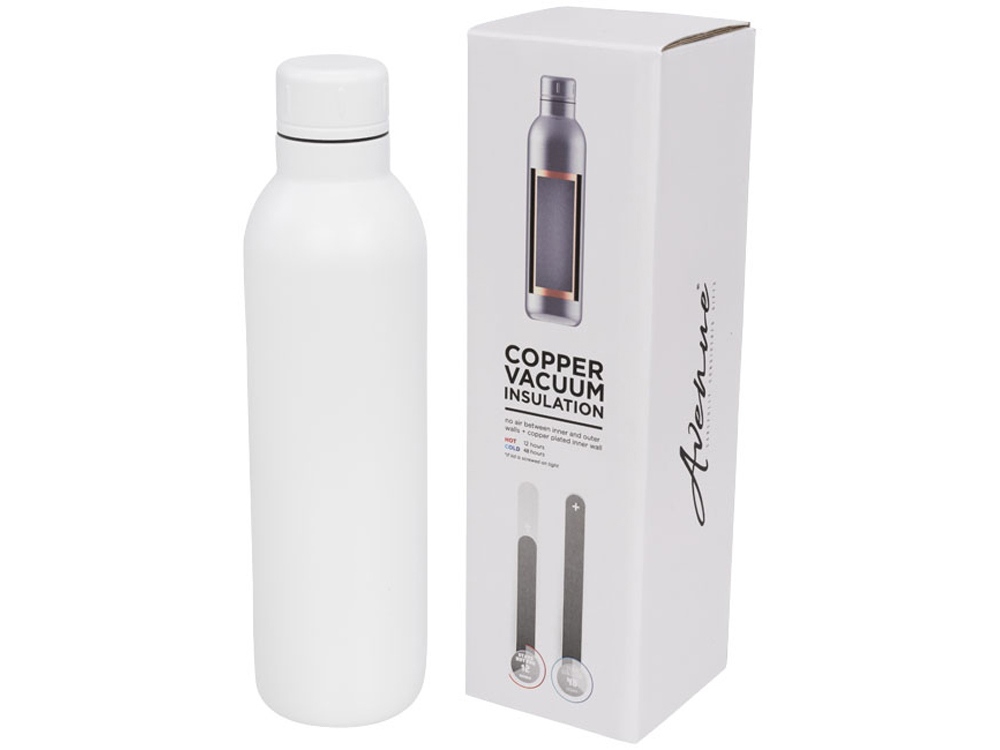 Спортивная бутылка Thor с вакуумной изоляцией объемом 510 мл. Прочная бутылка с двойными стенками из нержавеющей стали и вакуумной медной изоляцией сохраняет напитки холодными в течение 48 часов и горячими в течение не менее 12 часов. Конструкция бутылки предотвращает образование конденсата на внешней стороне. Модное, прочное порошковое покрытие. Герметичная завинчивающаяся крышка из нержавеющей стали. Объем – 510 мл. Предлагается в подарочной коробке Avenue. Нержавеющая сталь. Гравировка (CO2 лазер) (Без чернения) на данный товар осуществляется бесплатно. Оплачивается только настройка оборудования в размере 2700 рублей на весь тираж.