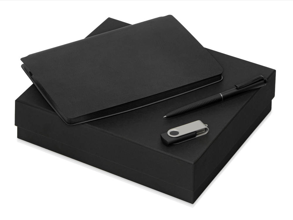 Подарочный набор Notepeno - это универсальный бизнес набор в современном стиле. С флеш-картой Квебек разъемом USB 2.0 все документы, презентации и договора будут под рукой. Блокнот Notepeno представлен в универсальном формате А5, отлично подойдет для любого мероприятия. Шариковая ручка Plane с фигурным корпусом soft-touch, который делает письмо невероятно комфортным. Набор упакован в дизайнерскую подарочную коробку из переплетного картона кашированного дизайнерской бумагой эфалин с ложементом из акустического поролона. Доступен в нескольких цветах. Тиснение (Блинт) на данный товар осуществляется бесплатно. Оплачивается только настройка оборудования в размере 8700 рублей на весь тираж.