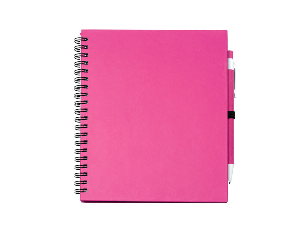 Блокнот на спирали с простыми листами и держателем для ручек. Твердая обложка и ручка из переработанного картона. 70 листов. Тампопечать (1 цвет (цветные изделия)) на данный товар осуществляется бесплатно. Оплачивается только настройка оборудования в размере 4500 рублей на весь тираж.