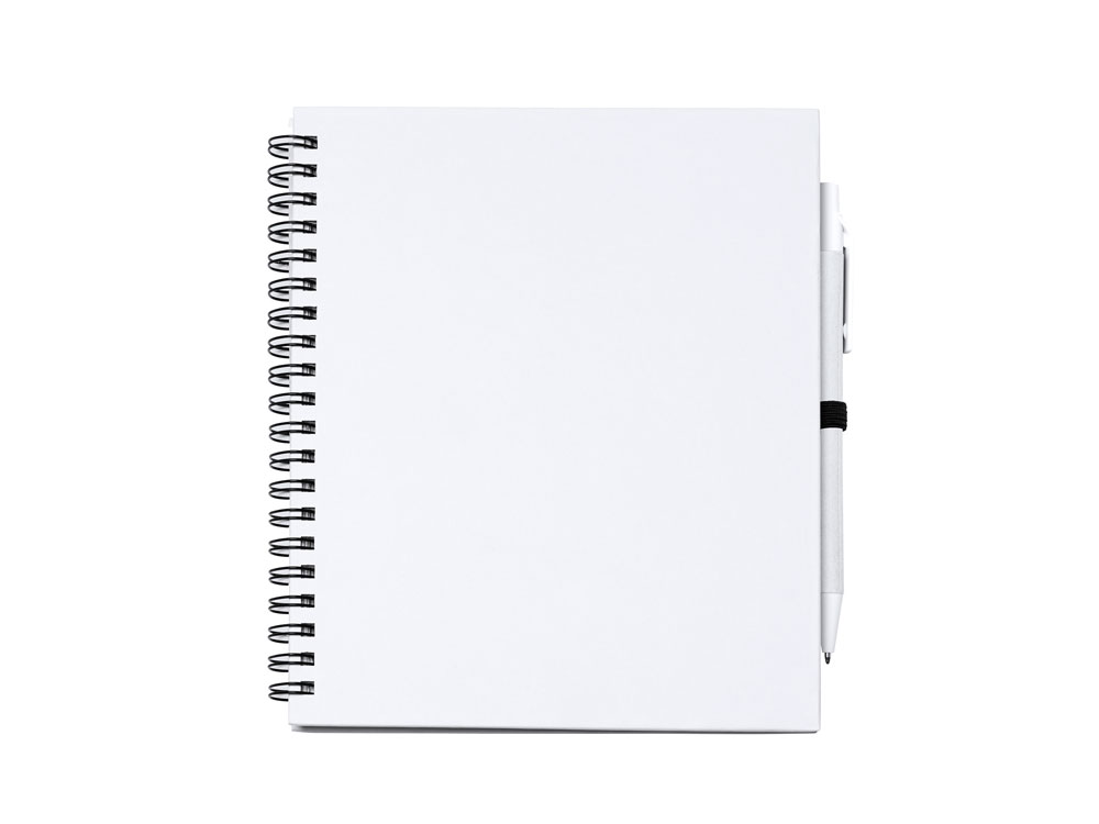 Блокнот на спирали с простыми листами и держателем для ручек. Твердая обложка и ручка из переработанного картона. 70 листов. Тампопечать (1 цвет (белые изделия)) на данный товар осуществляется бесплатно. Оплачивается только настройка оборудования в размере 4500 рублей на весь тираж.