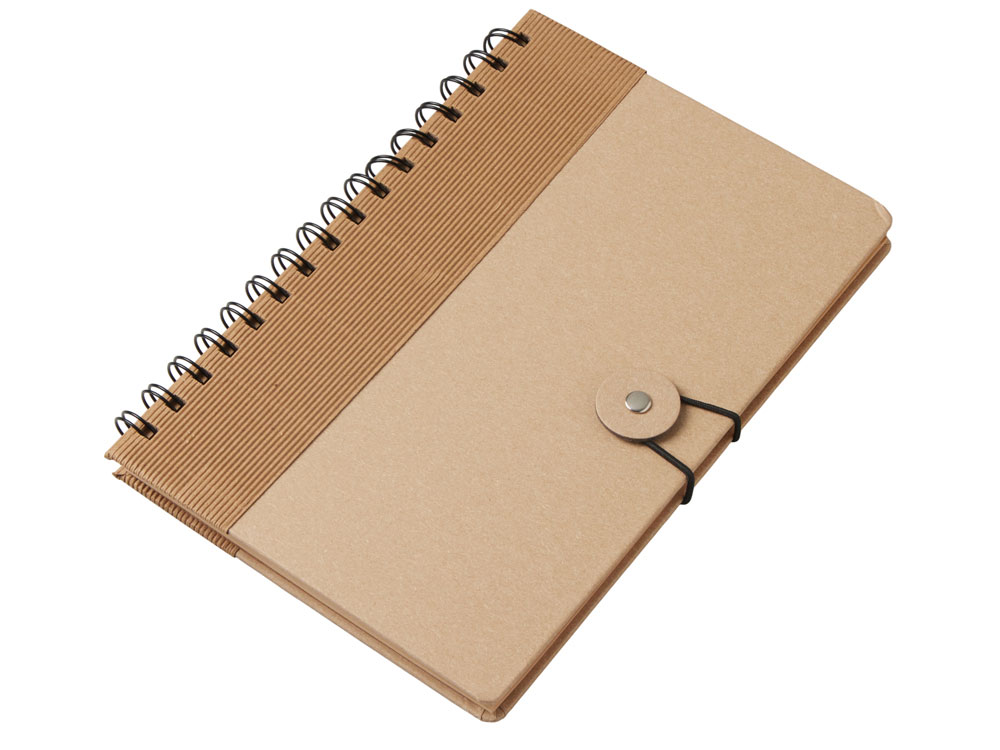 Крафтовый блокнот на спирали с фиксирующей резинкой. 80 листов коричневой бумаги 70 г/м2. Тампопечать (1 цвет (цветные изделия)) на данный товар осуществляется бесплатно. Оплачивается только настройка оборудования в размере 4500 рублей на весь тираж.