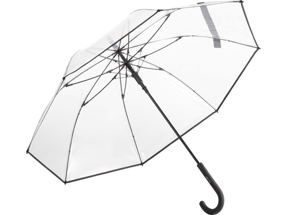 Зонт-трость с прозрачным куполом и контрастными деталями легко открывается нажатием кнопки на ручке. Каркас выполнен из прочной долговечной гальванизированной стали. Благодаря гибким спицам из стекловолокна зонту не страшны порывы ветра.