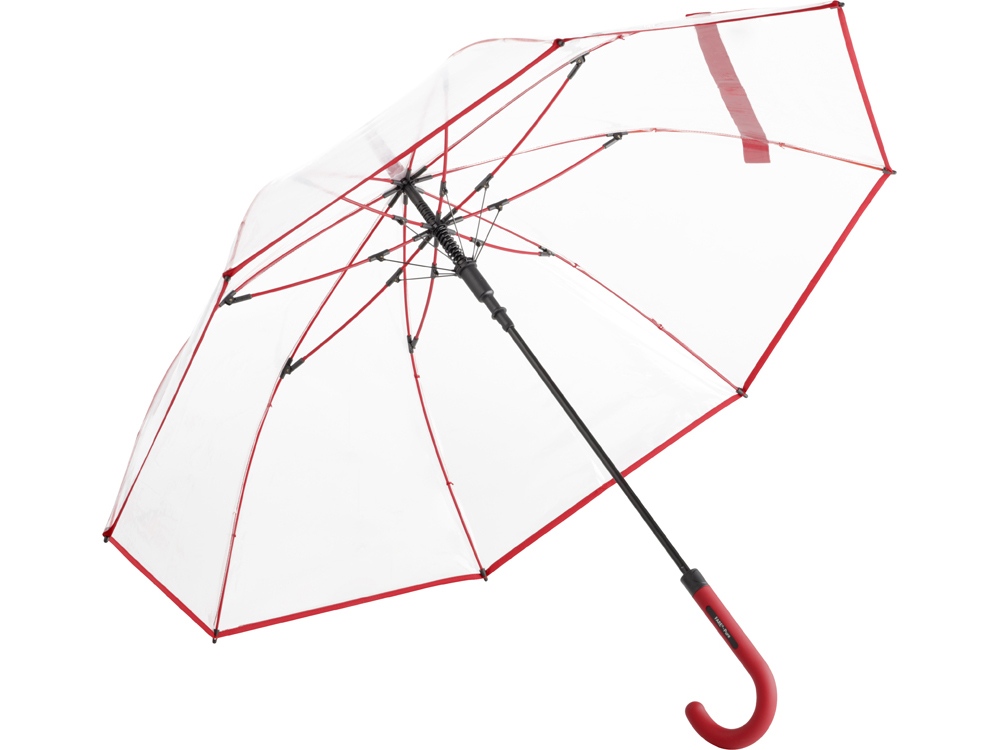 Зонт-трость с прозрачным куполом и контрастными деталями легко открывается нажатием кнопки на ручке. Каркас выполнен из прочной долговечной гальванизированной стали. Благодаря гибким спицам из стекловолокна зонту не страшны порывы ветра.