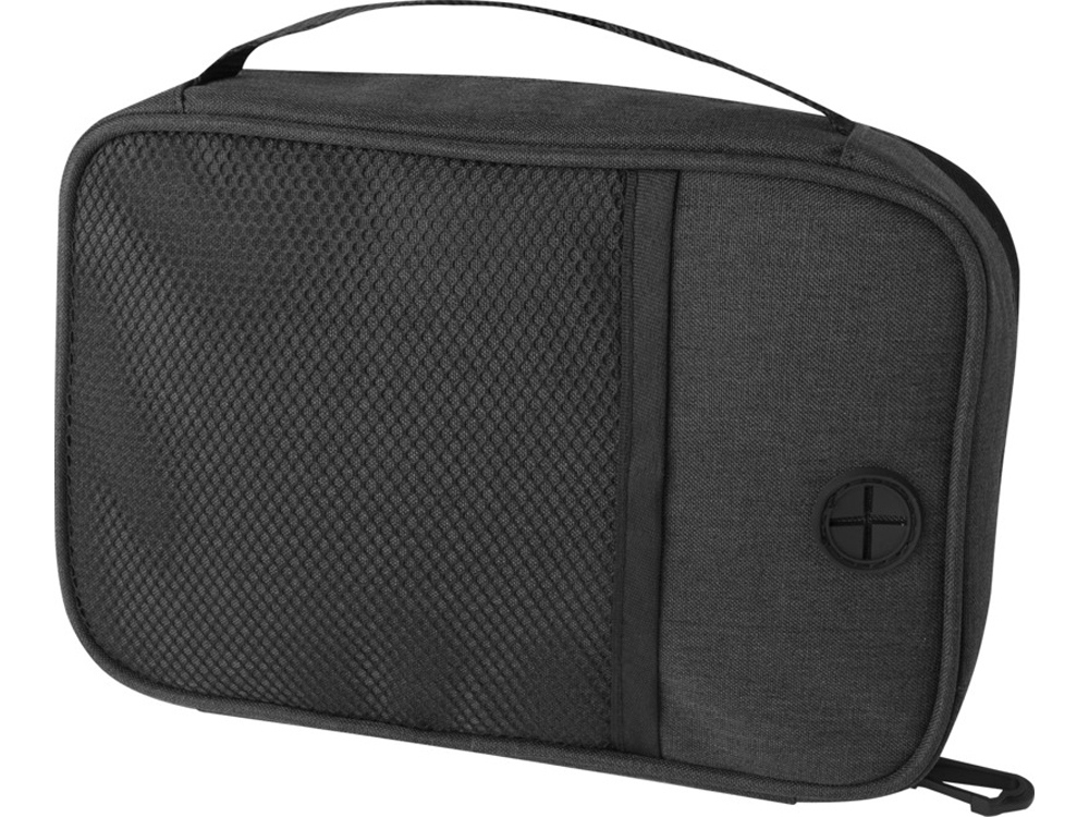 Сумка для техники Ross из переработанного ПЭТ, соответствующего стандарту GRS, идеально подходит для людей, постоянно находящихся в пути, и позволяет организовывать портативные зарядные устройства, зарядные кабели или любые другие электронные аксессуары. Имеет несколько карманов, эластичных петель и вставок для протягивания кабелей, позволяющих заряжать телефон, храня портативное зарядное устройство в сумке. Также имеет пластиковый карабин для крепления к другой сумке. Емкость: 1 литров. 300DGRS certified recycled polyester.