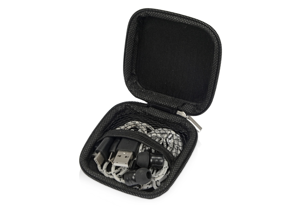 Набор In motion — оптимальный бизнес-подарок для подвижных, активных людей. В набор входят проводные наушники с минималистичным дизайном и зарядный кабель 3 в 1 с разъемами micro USB, Lightning (для устройств Apple) и USB-C. Яркий цвет кабеля не позволит ему затеряться среди других вещей. Набор поставляется в компактном чехле на молнии. Термотрансфер (1 цвет (цветные изделия)) на данный товар осуществляется бесплатно. Оплачивается только настройка оборудования в размере 10000 рублей на весь тираж.