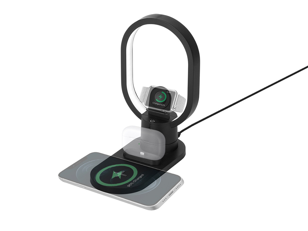 Настольная зарядная станция с лампой для трёх устройств - смартфона с поддержкой беспроводной зарядки, часов Apple и наушников Apple (разъем Lightning). Регулируемый уровень яркости (диммер). Лампу можно вращать вокруг своей оси. Для удобства транспортировки лампу можно отсоединить.