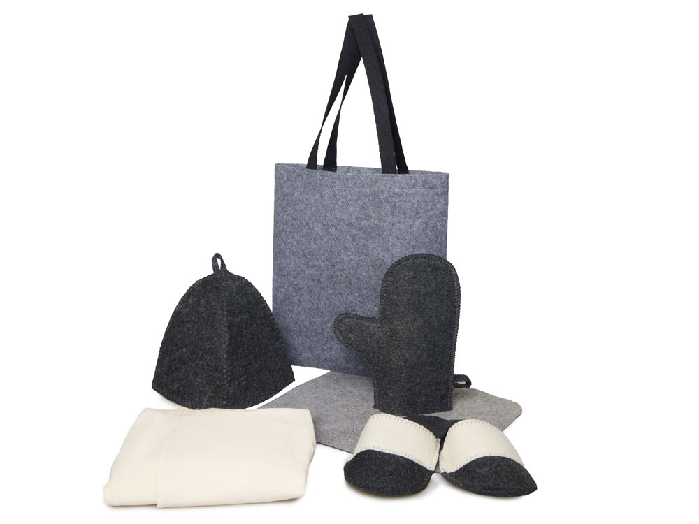 Банный набор Healing для настоящего ценителя сауны: коврик, мужской холщовый килт, рукавица, шапка, двуцветные тапочки — всё в стильном фетровом шоппере.