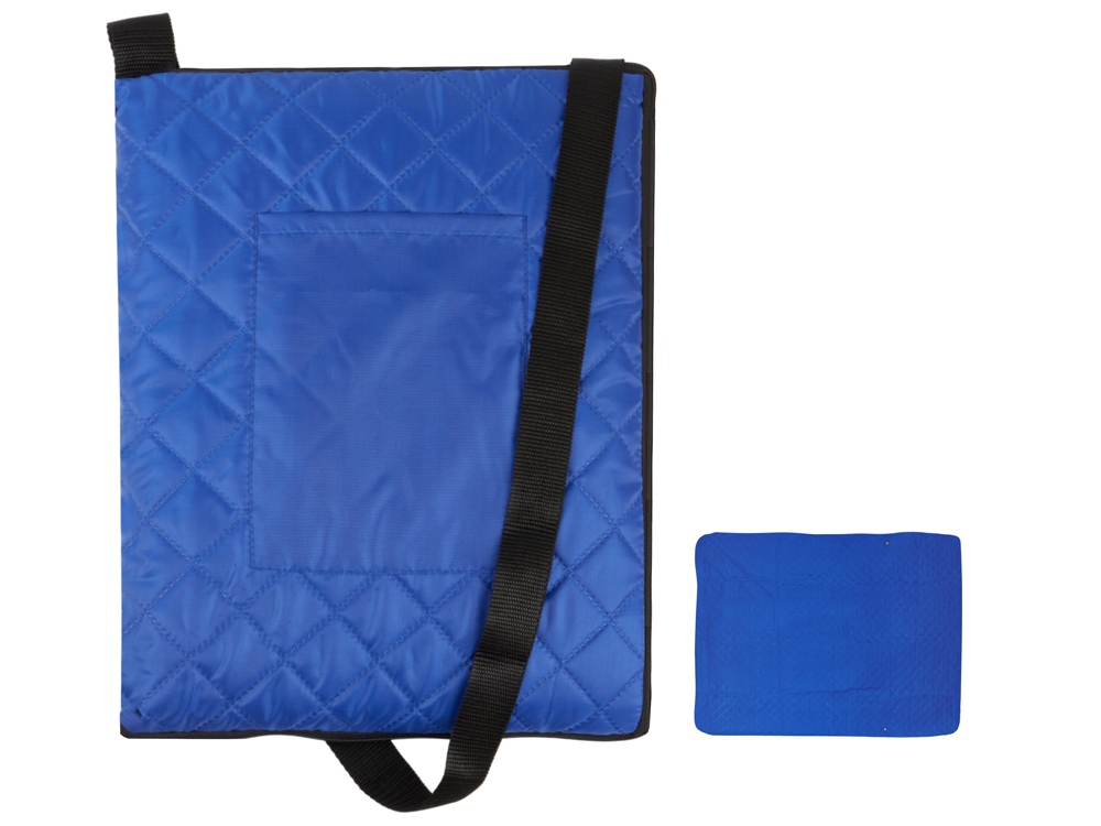 Двухсторонний плед с водоотталкивающим покрытием с одной стороны и мягким флисом с другой. Складывается в сумку на плечо и фиксируется с помощью молнии. В собранном виде имеет регулируемый по длине ремень для переноски и наружный карман для мелочей.