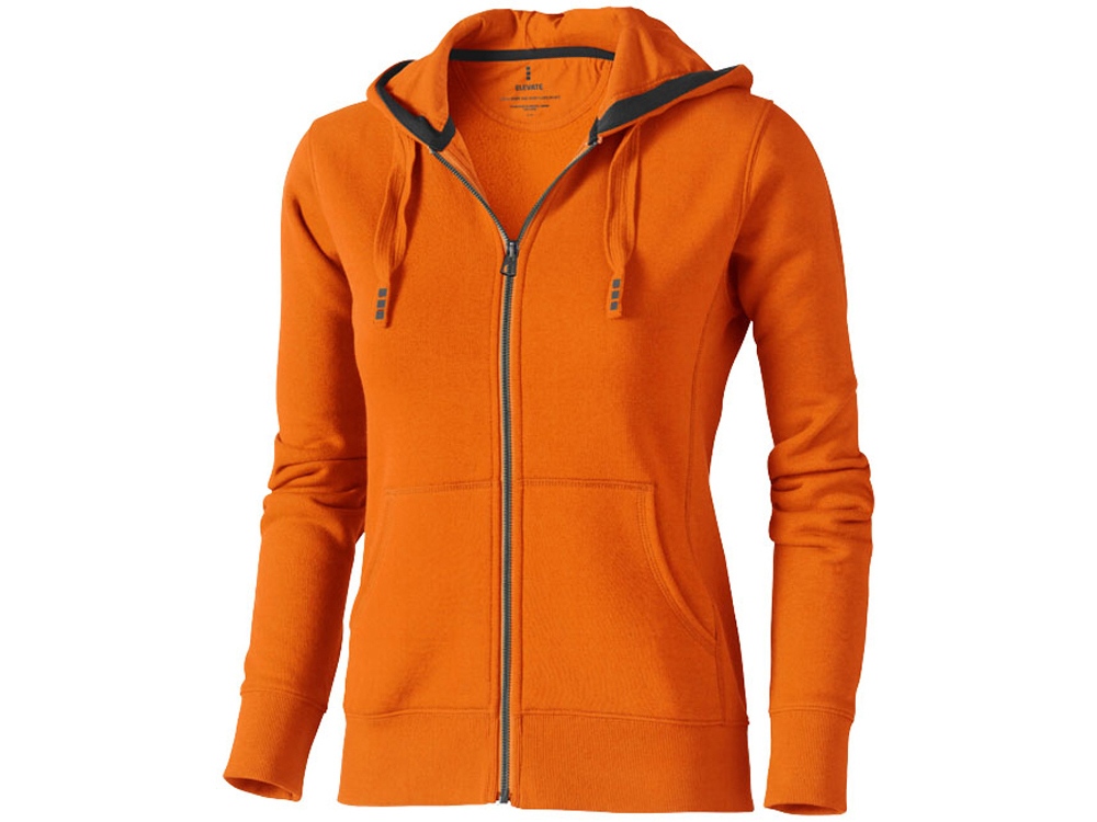 Женский свитер Arora с капюшоном и застежкой-молнией на всю длину. Стандартный покрой. Резинка 2х2 на боковых вставках, поясе и манжетах. Карман кенгуру. Мужская и женская модели с завязками на капюшоне. Подкладка внутри капюшона. Атласная лента внутри горловины. Принт лого сзади в тон изделия. Серебристые люверсы с лого. Ворсистый внутри для мягкости, тепла и комфорта. Трикотаж: 80% хлопок и 20% полиэстер, чесаная внутренняя сторона. 300 г/м². Трафаретная печать (1 цвет (цветные изделия)) на данный товар осуществляется бесплатно. Оплачивается только настройка оборудования в размере 10000 рублей на весь тираж.