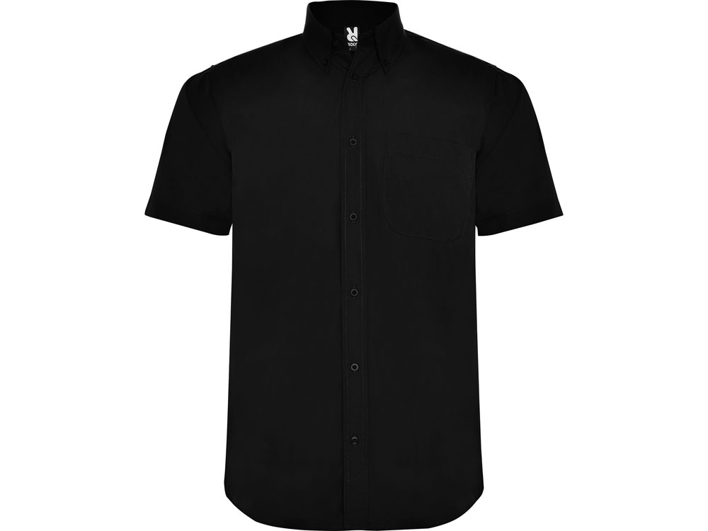 Рубашка мужская с коротким рукавом на семи пуговицах. Накладной карман на груди слева, закругленный низ изделия. Уголки воротника продублированы пуговицами.