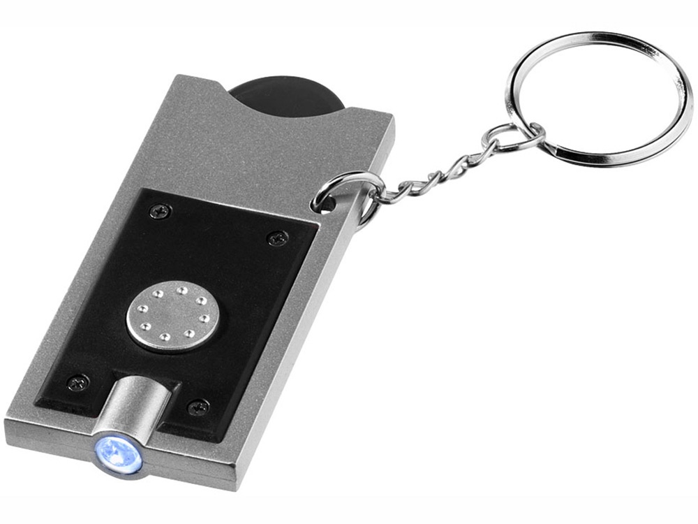 Пластиковый держатель для монет достоинством 1 евро размером Ø 6 мм с одним белым светодиодом для ключей. Металлическое кольцо для ключей Ø 25 мм. Тампопечать (1 цвет (цветные изделия)) на данный товар осуществляется бесплатно. Оплачивается только настройка оборудования в размере 4500 рублей на весь тираж.