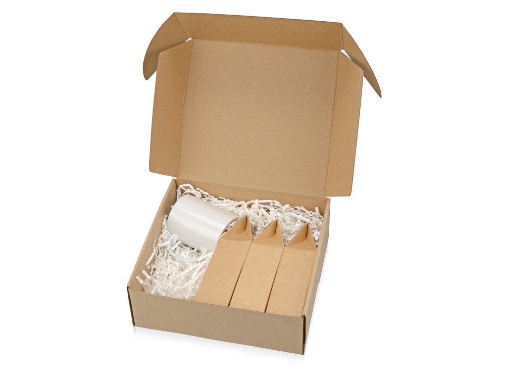 Прекрасный набор из черного, зеленого и фруктового чая придется по вкусу даже самым требовательным клиентам, а кружка Марго с вашим логотипом или промо информацией будет напоминать об успешном сотрудничестве. Набор упакован в крафтовую картонную коробку, которую также можно персонализировать. Тампопечать (1 цвет (белые изделия)) на данный товар осуществляется бесплатно. Оплачивается только настройка оборудования в размере 4500 рублей на весь тираж.