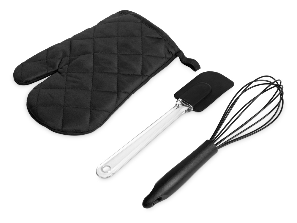 Набор Canele состоит из трёх предметов, без которых не обходится приготовление ни одного пирога или торта: венчика для взбивания яиц или крема, лопатки и прихватки для горячего.