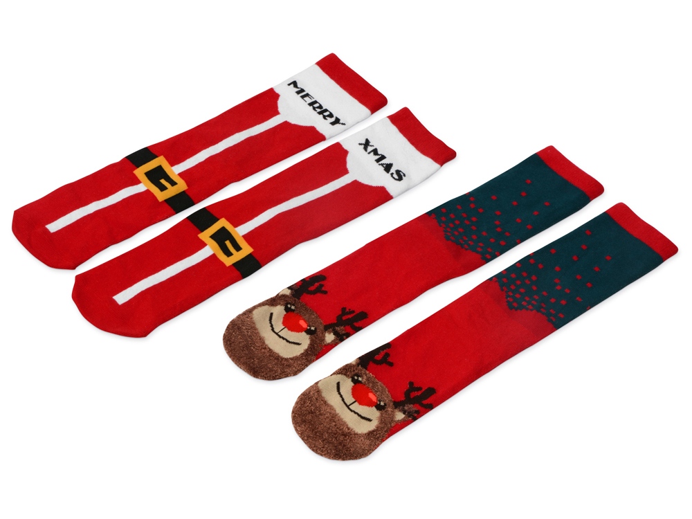 Рождественские носки прекрасно подойдут на роль подарка, который создает праздничное настроение. Этот набор состоит из двух пар, которые упакованы в мешочек из натурального хлопка. Одна пара украшена мягкими пушистыми мордочками рождественских оленей, а принт на второй изображает сапожки Санта Клауса. Ткань -- смесь хлопка, полиэстера и спандекса, что обеспечивает носкам износостойкость, а мягкая широкая резинка – удобную посадку по ноге. Мешочек-упаковку можно брендировать по вашему желанию.