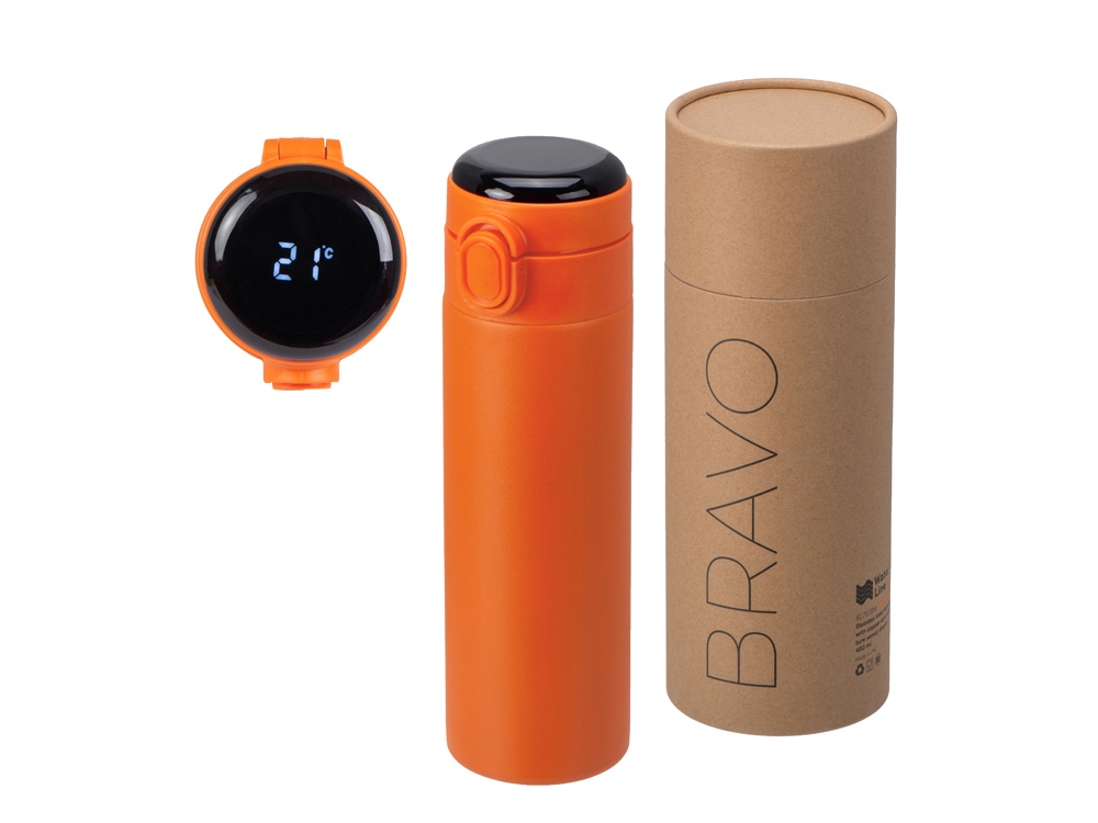 Вакуумная термокружка с медной изоляцией между стенками, которая точно не даст вам обжечься: сенсорный индикатор температуры сообщает о температуре напитка, выводя на дисплей информацию в градусах Цельсия. Что немаловажно, сенсор работает от сменной батарейки, что существенно продлит срок службы Bravo, позволяя не расставаться с полюбившейся термокружкой.