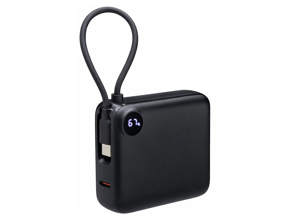 - Встроенный двунаправленный кабель-петелька USB-C — всегда под рукой! Заряжает смартфоны по USB-C (в т.ч. новые iPhone), а также заряжается сам по встроенному кабелю.