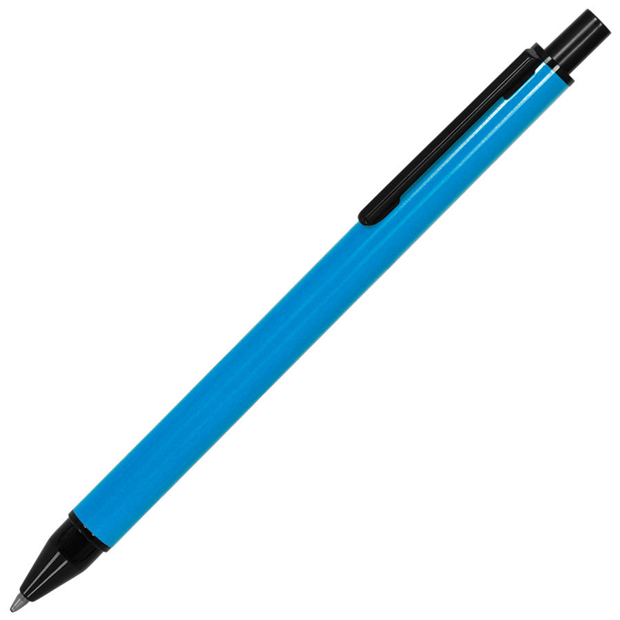 Яркая металлическая ручка простой формы - универсальный носитель рекламного сообщения. Цвет, близкий к Pantone 2995C. Стержень Plastic Parker Type, синий, толщина пишущего узла 1 мм
